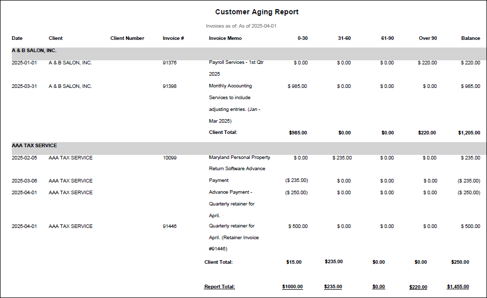 The Detail AR Report provides a list of all accounts receivables for the selected criteria. Columns include the Date, Client, Client Number, Invoice #, Invoice Memo, 0-30, 31-60, 61-90, Over 90, and Balance.