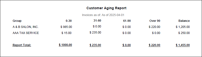- The Summary report displays the total AR by Group. Columns include the Group, 0-30, 31-60, 61-90, Over 90, and Balance.